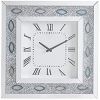 • Square Clock (Wall)• Beveled Mirrored, Clear Glass & Faux Agate with Faux Diamonds Inlay• Clock Mechanism: Quartz, Battery Required: 1A Not Included• Chime Sound: Not Included (Low Ticking)• Dial Numeral Type: Roman